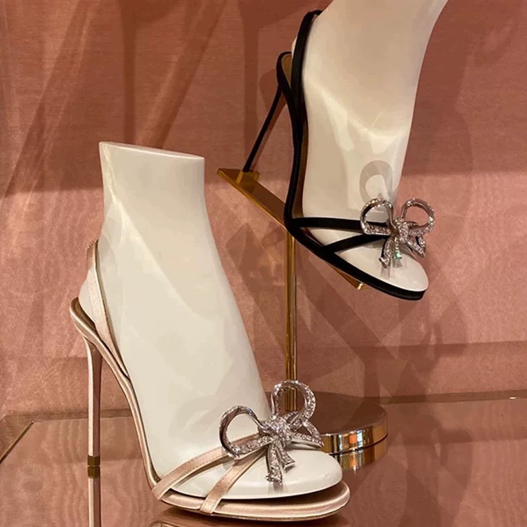 Luxury Silver Diamond Women's Luxury High Heels Round Rhinestone Glitter Bow Decor Bridal Wedding Sandals for Summer