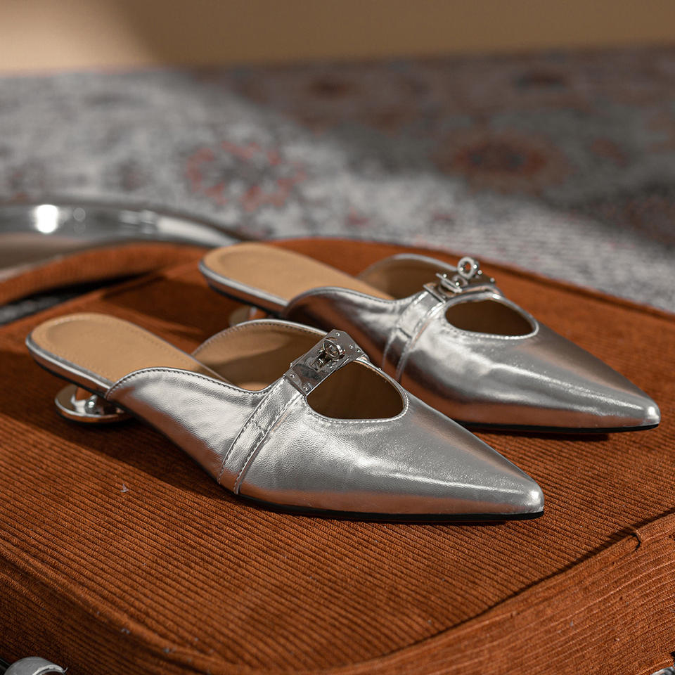 Luxury Silver Women's Sandals Pointed Toe Pump Low Heel Leopard Pattern High Quality EVA Insole Button Slip-On Party Shoes