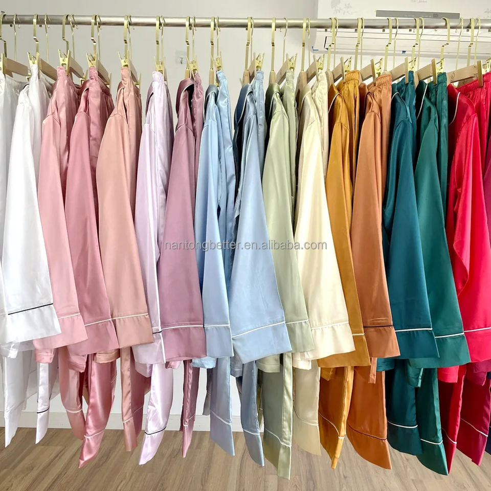 Pigiama da Donna da Sposa di Lusso in 2 Pezzi Effetto Seta Liscio Tinta Unita, Set con Maniche Lunghe e Pantaloni Lunghi con Elastico in Vita