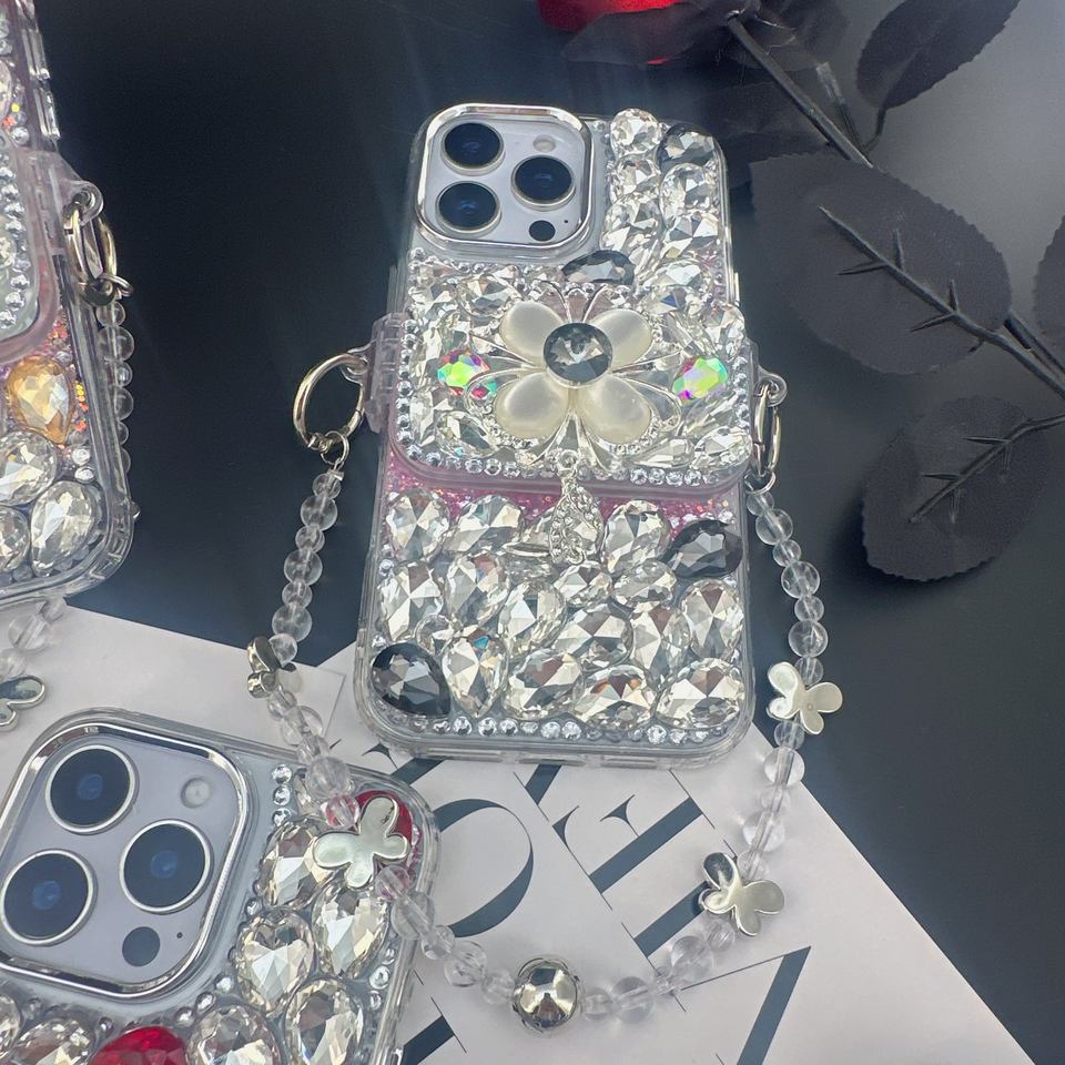 Luxury Sparkling Rhinestone Phone Case for Apple for iPhone 16 ProMax and for iPhone 15 Pearl Wristband Mobile Phone Case