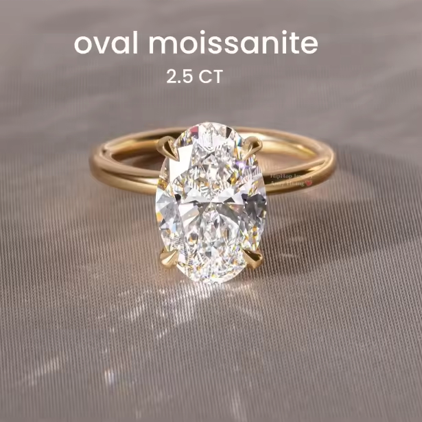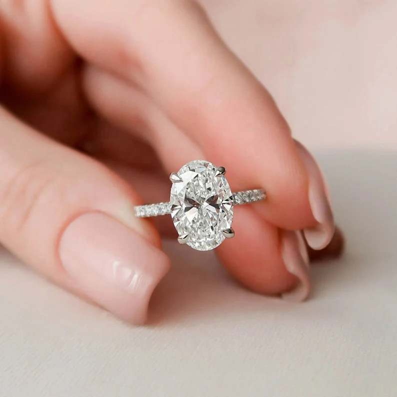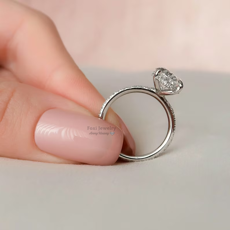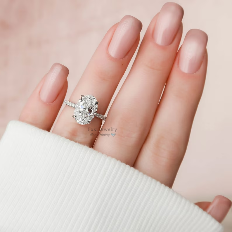 Anello di Fidanzamento di Lusso in Argento Sterling 925 Placcato Oro Bianco con Moissanite Ovale da 2,5 CT, Classico Anello Solitario con Halo Nascosto