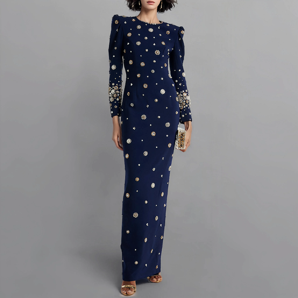 Luxury Vestidos De Festa Rhinestone Pearl Beaded Long Gown Evening Dinner Dresses Elegant Dark Blue Long Formal Dress for Women
