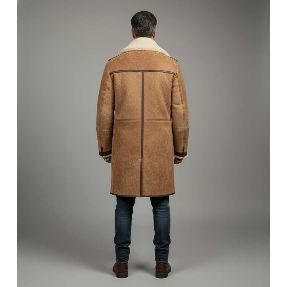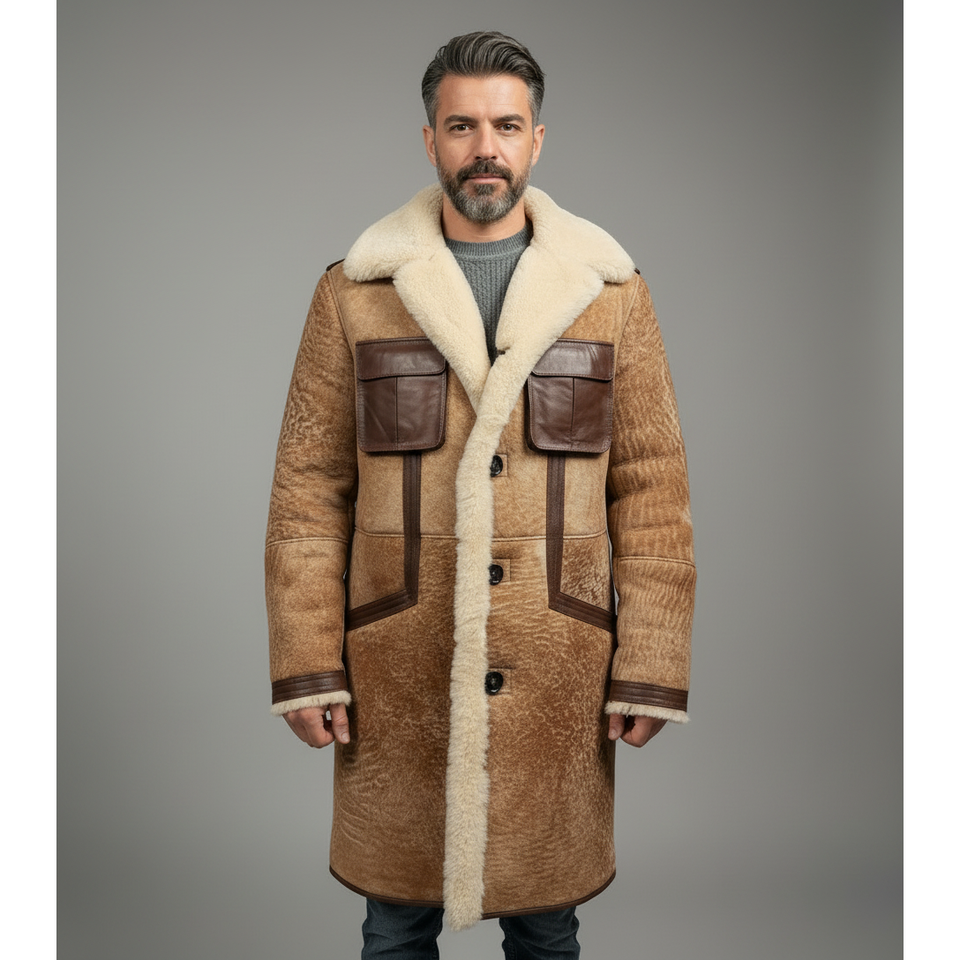Luxury Winter Men's Outerwear Long Shearling Handmade OEM Private Label Coat Leather Pockets Customizable Private Label