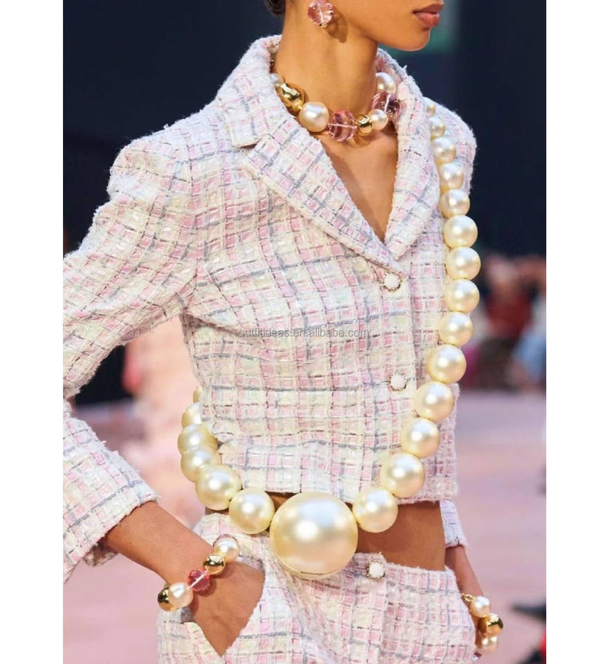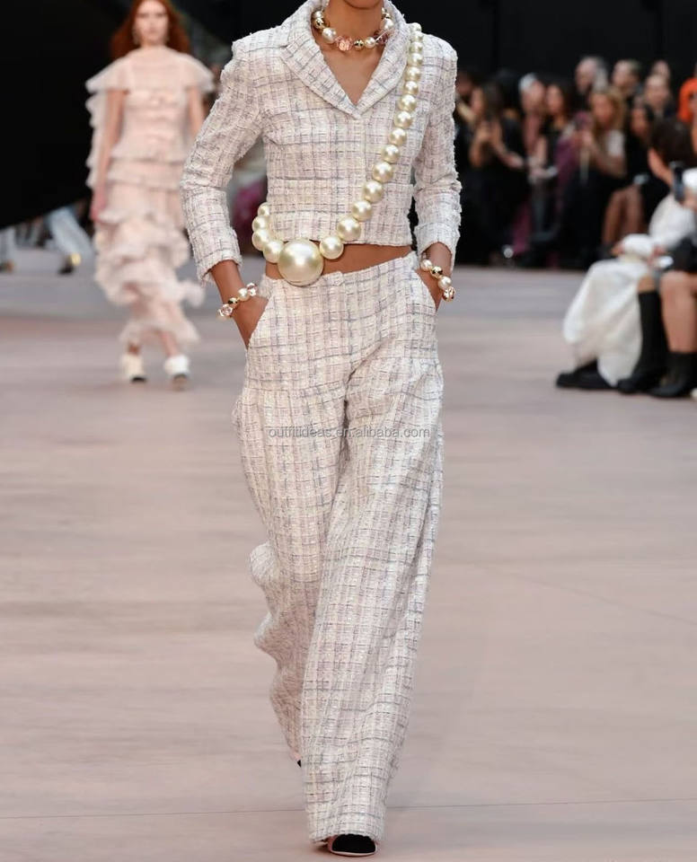 Luxury Women Runway Cotton Tweed Pants Pink White Tweed Cropped Jacket Pants Set Wool Tweed Suits Cropped Jacket Pants Set
