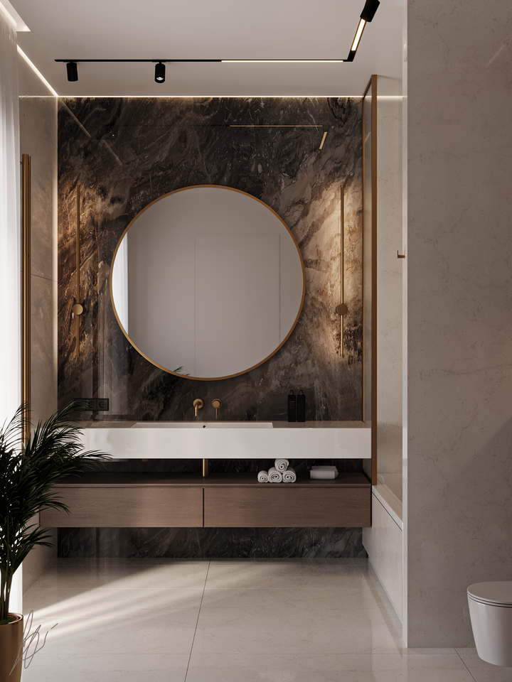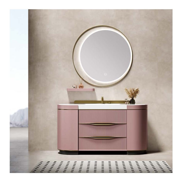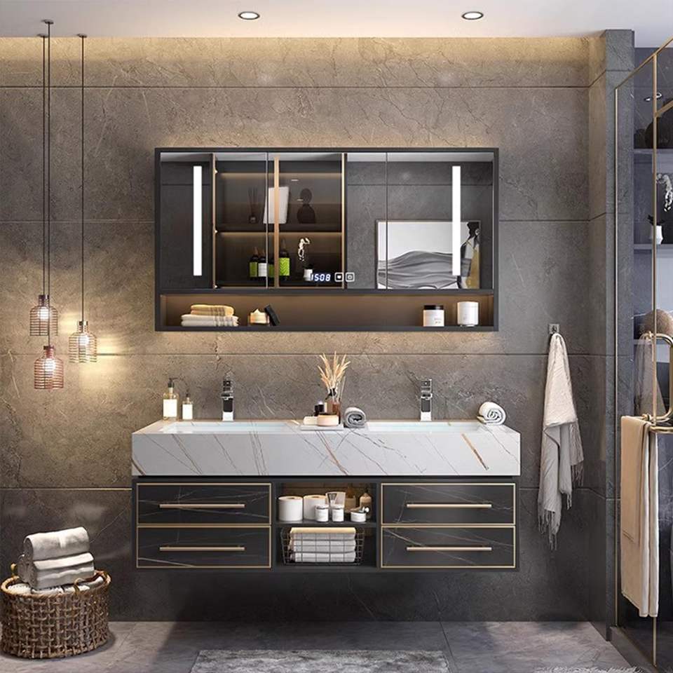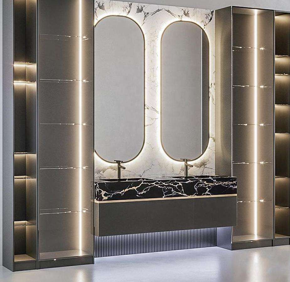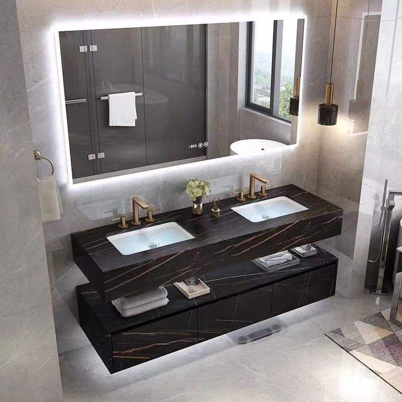 Mobile Bagno di Lusso con Pannello in Legno, Top in Marmo, Base in MDF, Compensato e PVC, Lavabo e Specchio