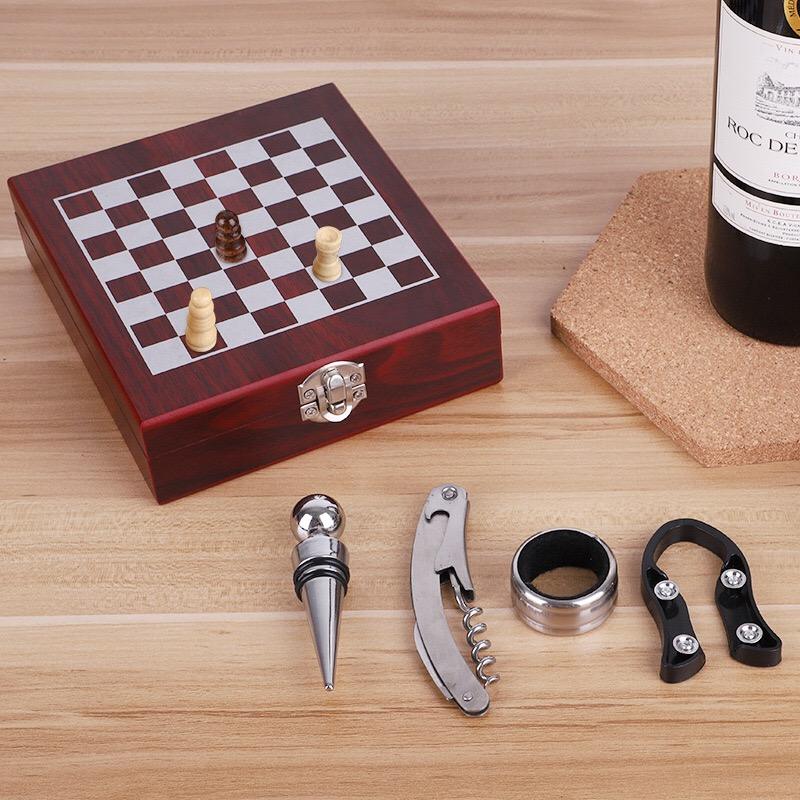 Luxury Wooden Wine Corkscrew Bottle Opener with Chess Set Accessories & Chess Box Gift Set