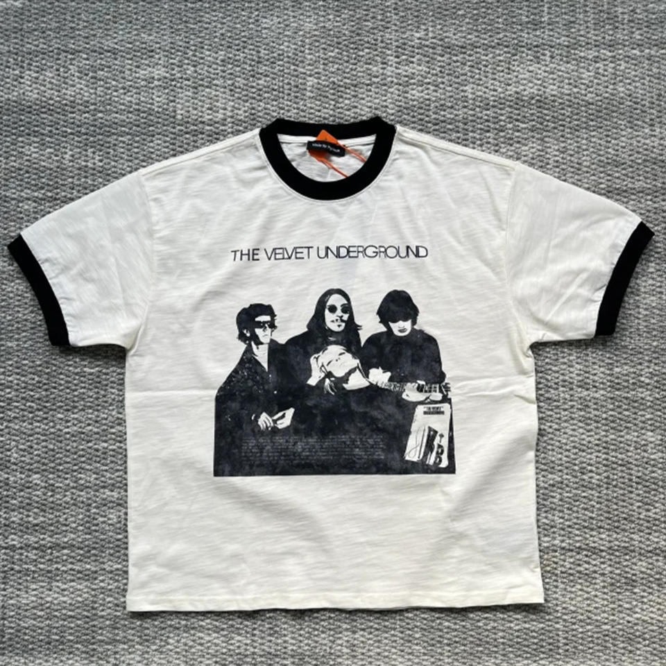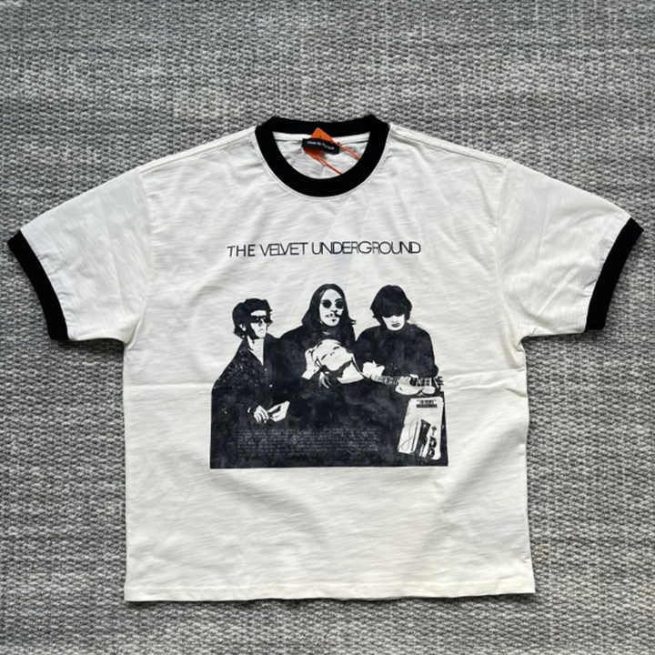 MC BUILD Summer High Quality Beige White Rock Band Theme Commemorative T-Shirt Ringer Tee Retro Design Boxy Short Sleeve T Shirt