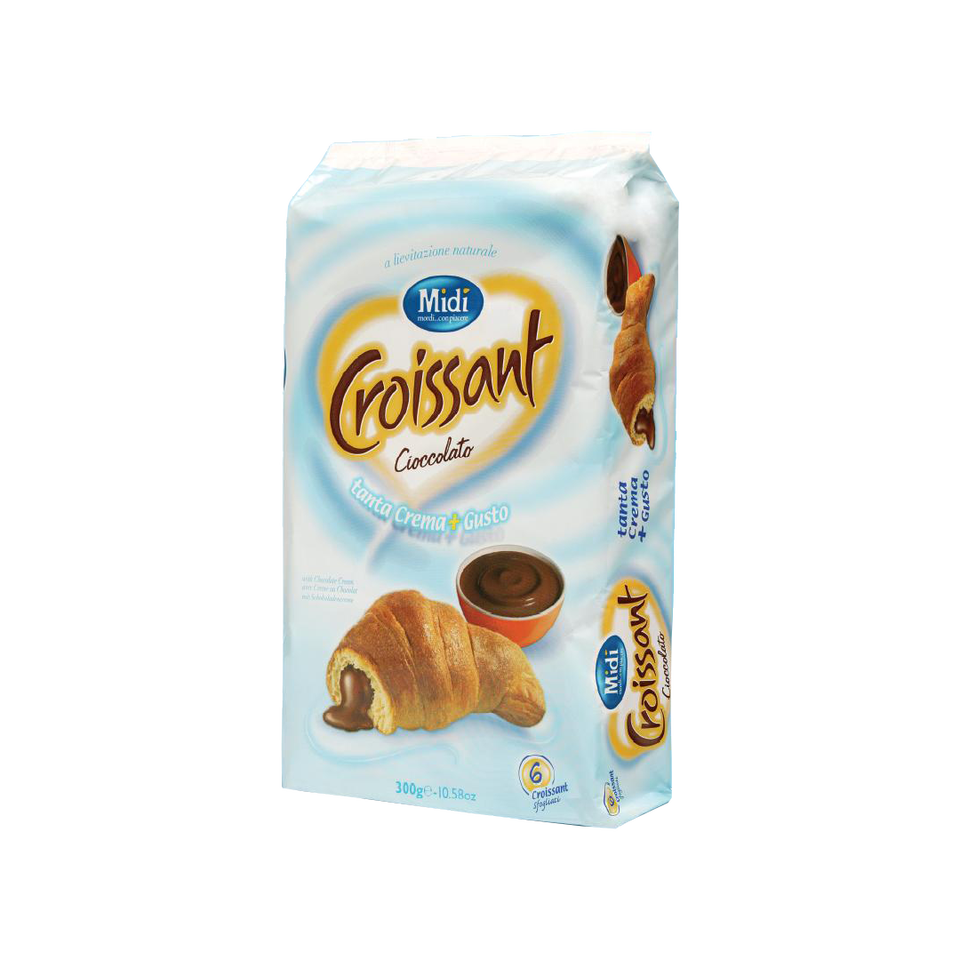 Confezione da 6 Croissant al Cioccolato, Farina di Grano, Consistenza Semi-Morbida, G.300X12, Pane Dolce