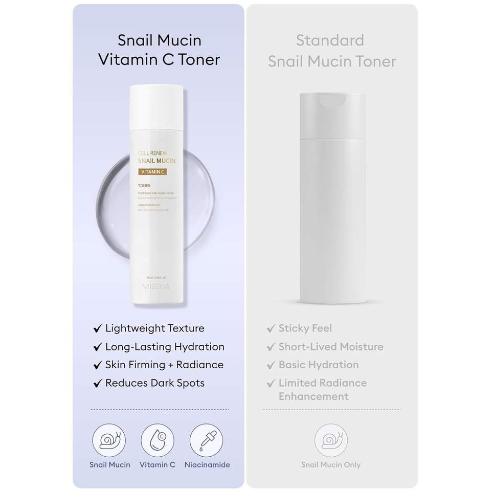 MISSHA 5.07 Floz lumaca mucina vitamina C Toner coreano cura della pelle Toner viso 90% lumaca mucina Vita complesso per la pelle di vetro profondo