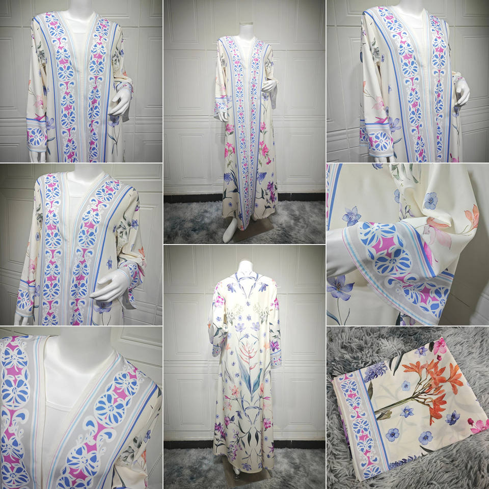 MQ223 Abaya Aperta Modesta per Donne Musulmane, Vestito Stampato Islamico del Medio Oriente, Abaya Dubai Cardigan con Hijab