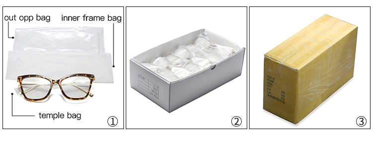 1 out opp bag/pcs,1 frame bag,1 temple bag,20pcs/white box, 500pcs/carton