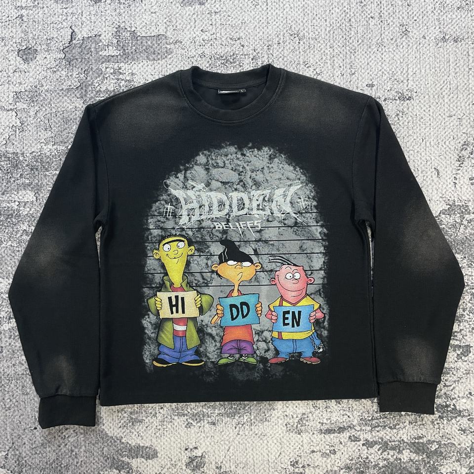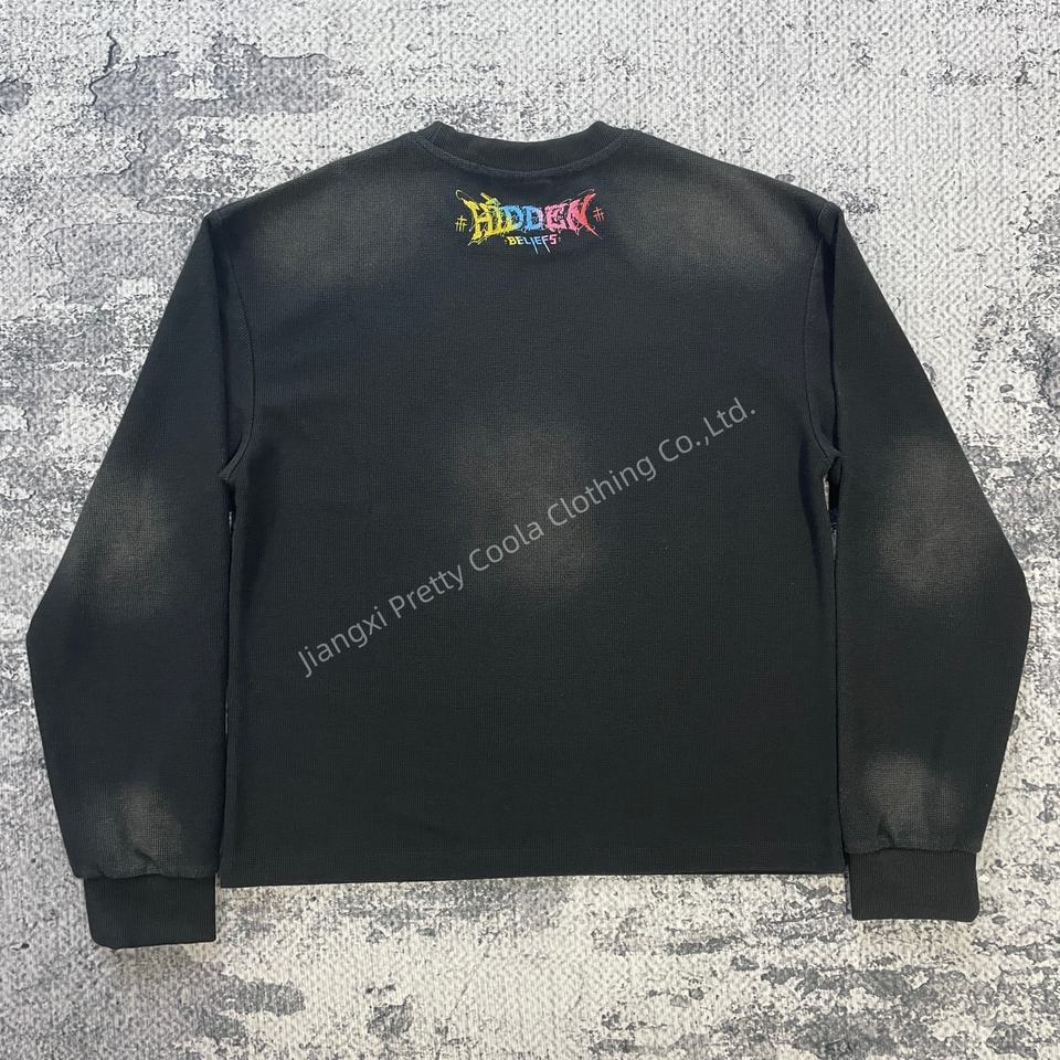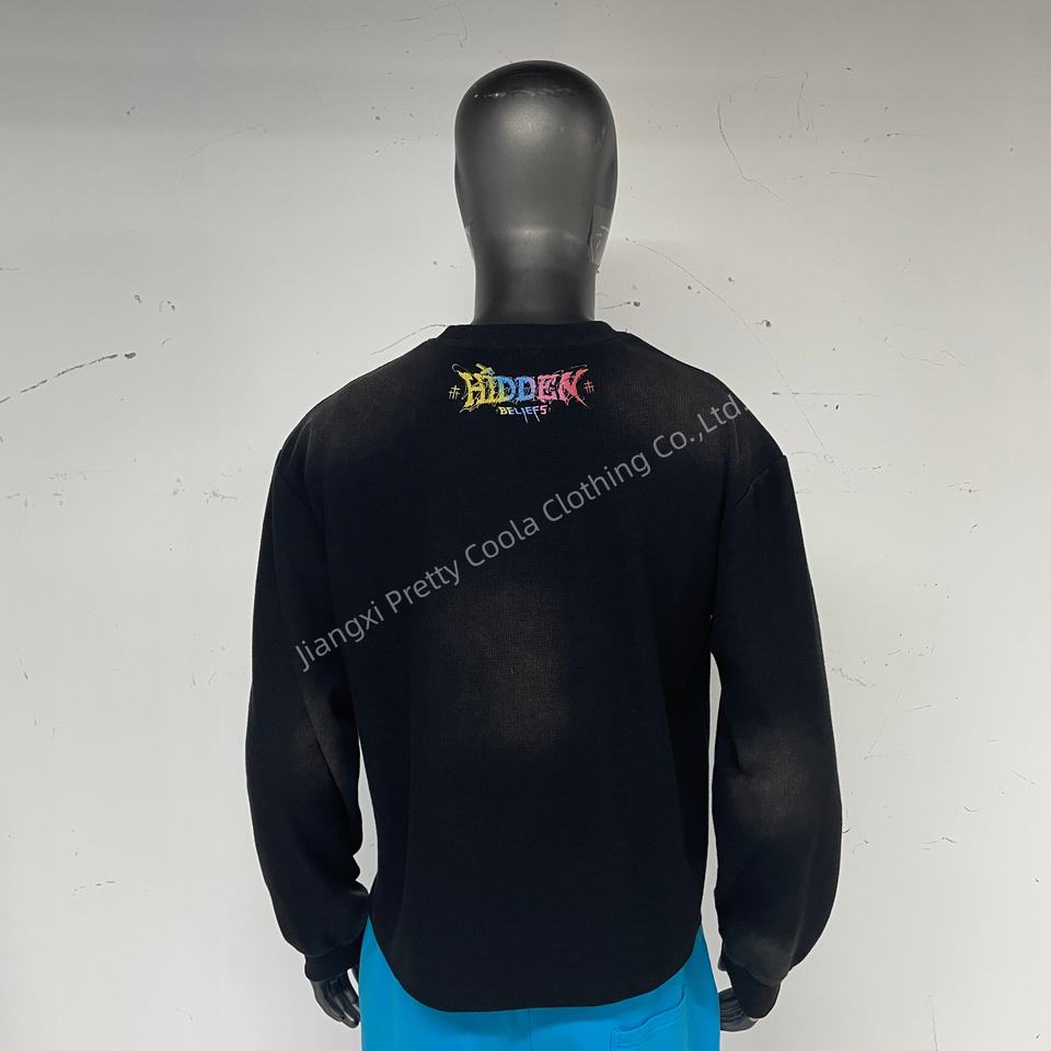 MT1558 Factory Fully Custom DTG Printed Logos Vintage Long Sleeve T Shirt Black Acid Wash Waffle Thermal Long Sleeve Shirt Men