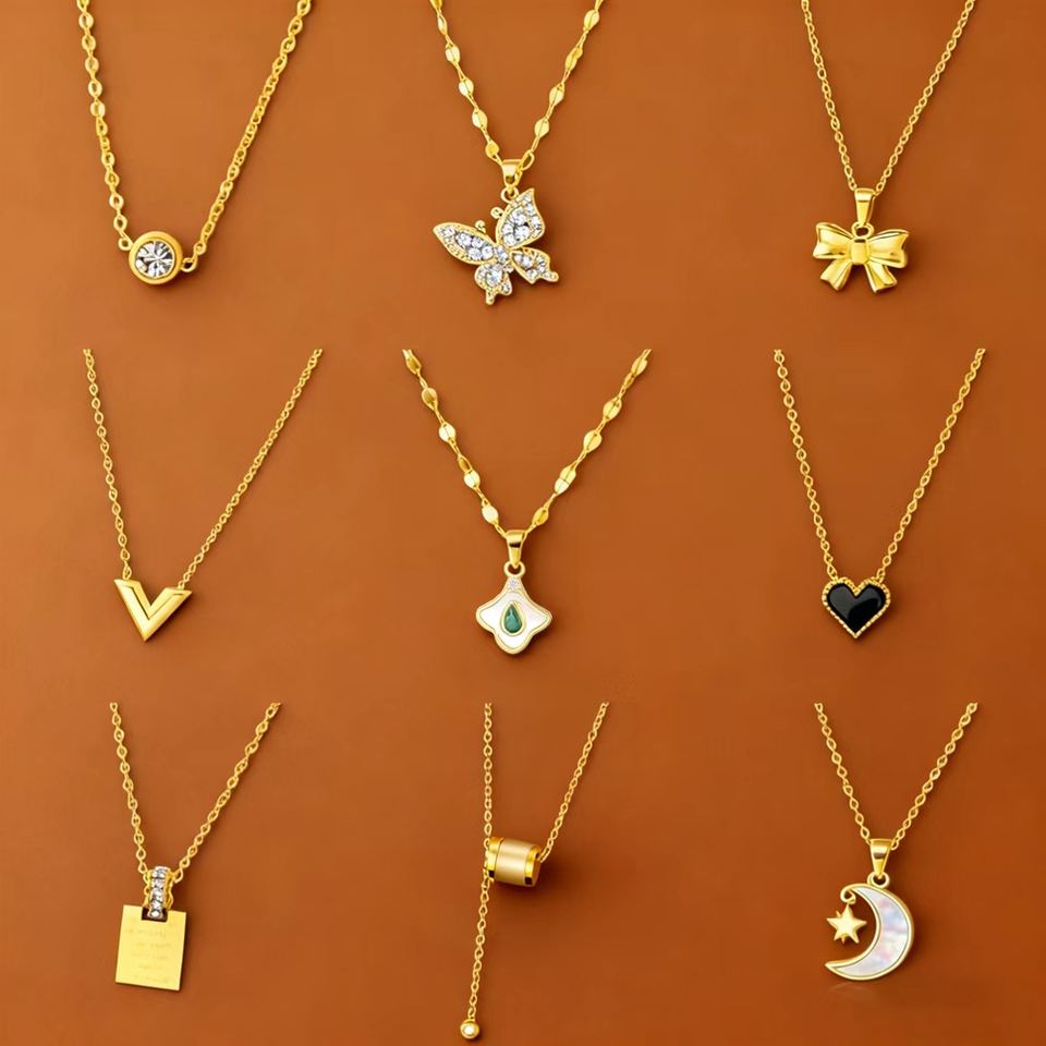 Collana da Donna MW di Alta Qualità in Acciaio Inossidabile Placcato Oro 18k PVD, Antiossidante, con Ciondoli a Farfalla, Fiocco, Cuore e Luna