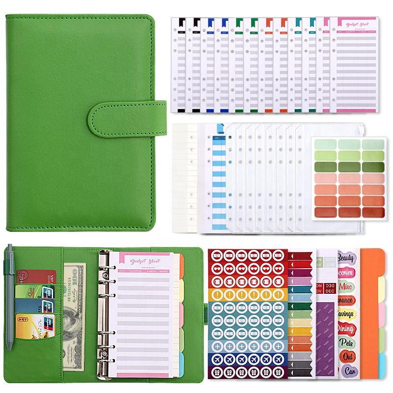 Taccuino di contabilità a fogli mobili Macaron A6 con buste con cerniera, fogli e etichette di Budget