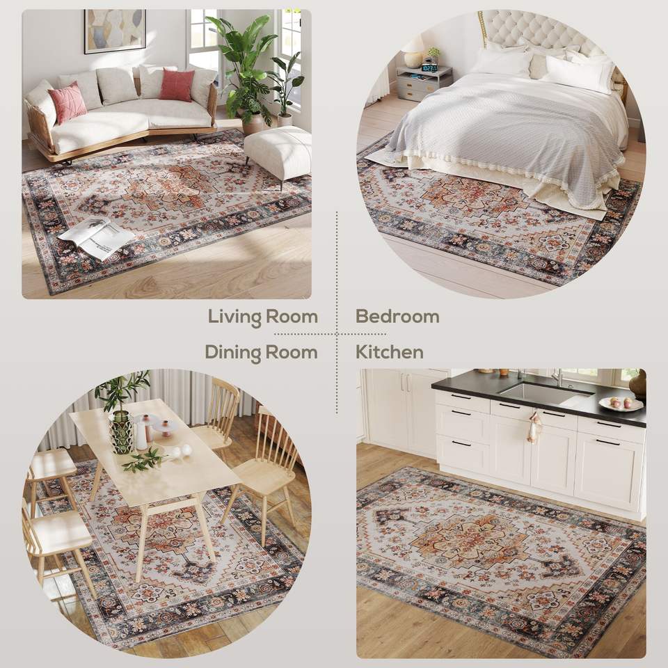 Tappeto Lavabile in Lavatrice 5x7 Antiscivolo con Stampa Boho e Motivo a Medaglione, Colore Marrone Fulvo per Soggiorno e Camera da Letto
