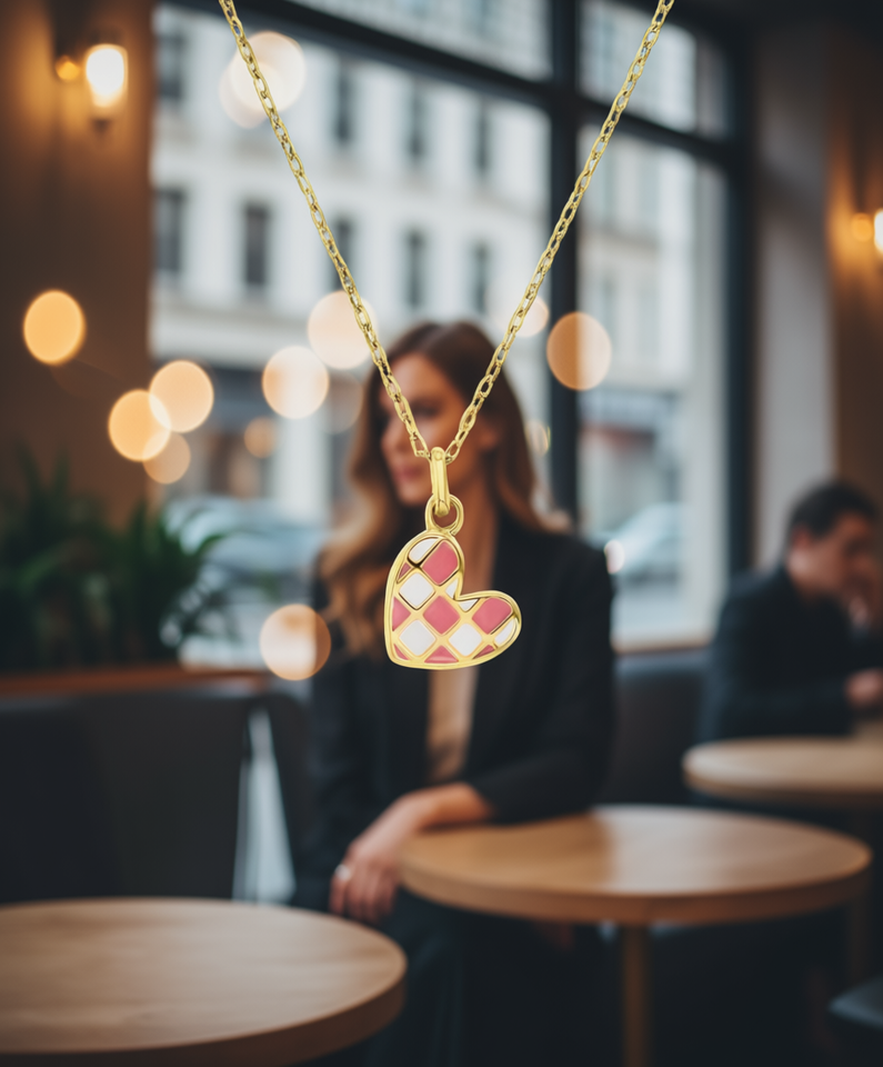 Macy's Enamel Heart Checkerboard Pendant Necklace 14k Gold Plated 13 In With Extender Women's Fashion Jewelry