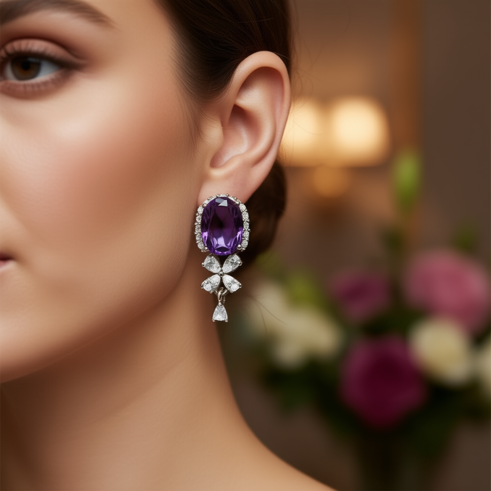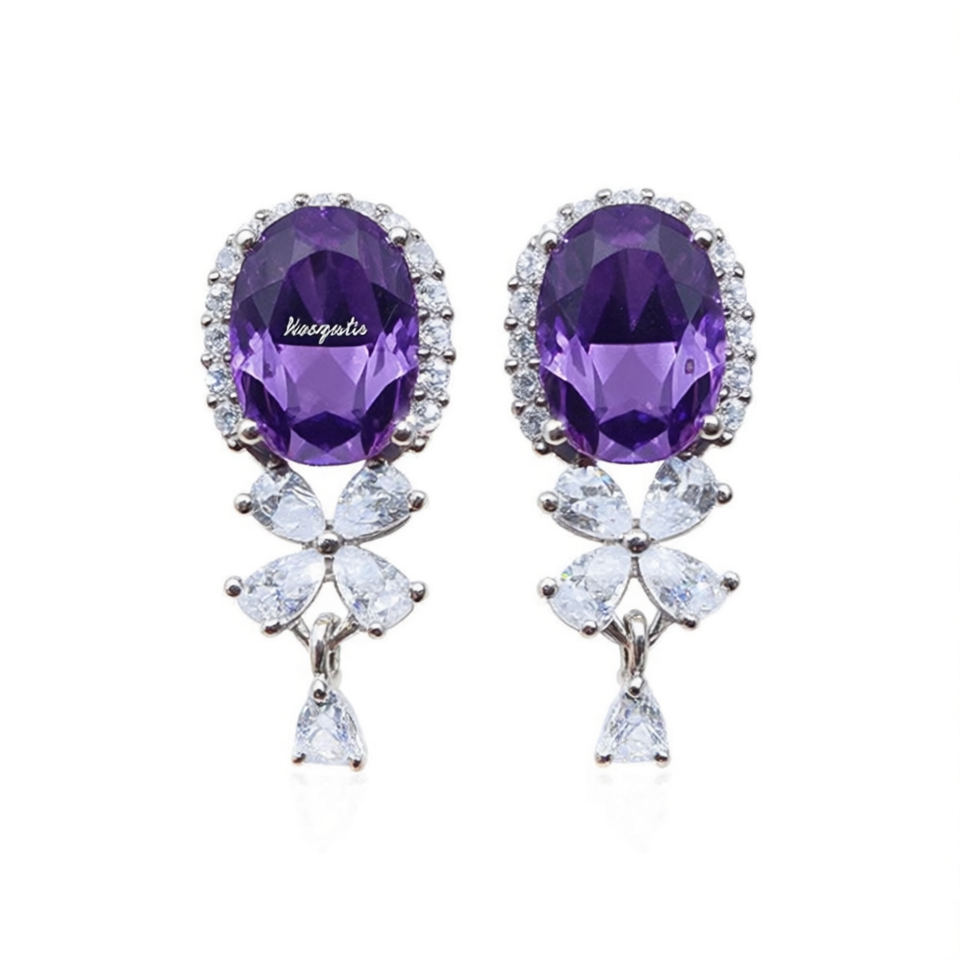 Maegestic Purple Drop Earrings With Oval Gemstone And Pear Cut Crystal Flower Design For Women Party Jewelry