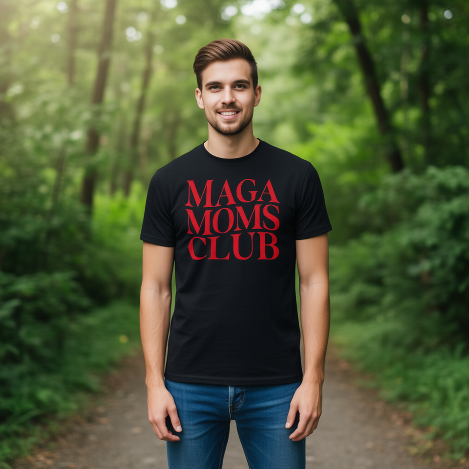T-shirt Maga Moms Club con testo rosso, cotone nero, taglia adulta unisex