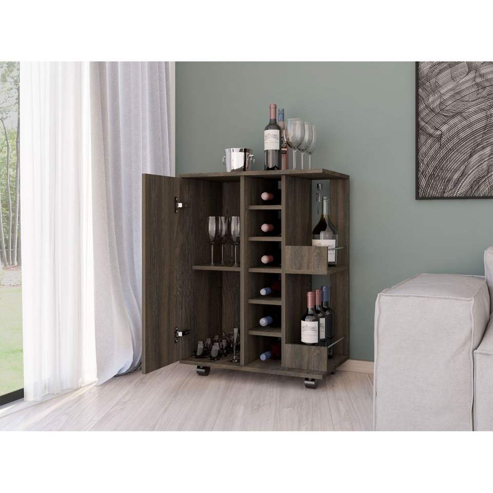Magda carrello Bar a porta singola con quattro ruote, sei portabottiglie incorporate e due ripiani esterni per bevande