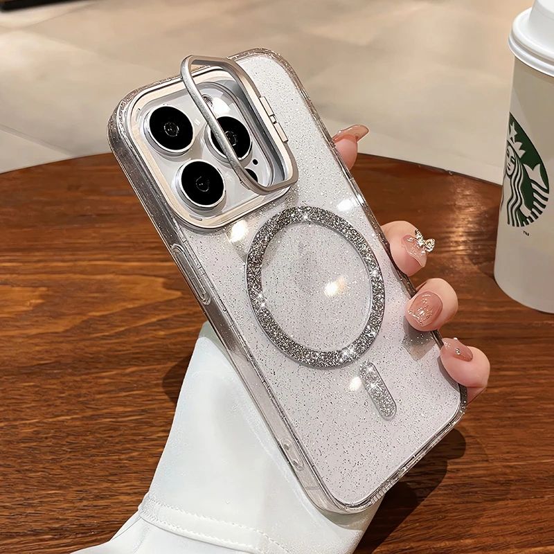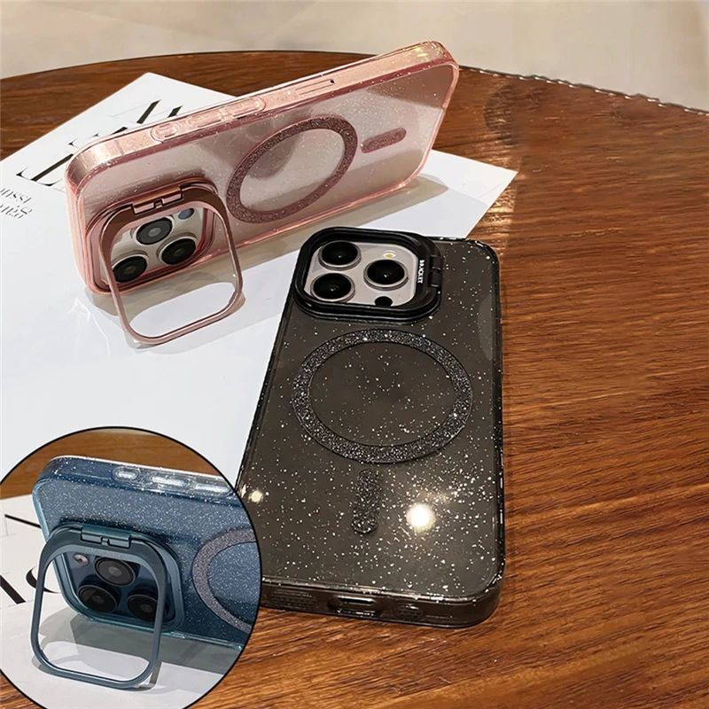 Carica magnetica Wireless Glitter custodia trasparente per iPhone 15 16 14 13 12 11 porta fotocamera pieghevole Cover antiurto per Iphone15