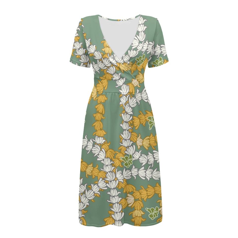 Maile Style Ti Leaf Lei Floral Print V Neck Short Sleeve Women's Dresses Wholesale Hawaii Flower Lei Casual Summer Beach Dress