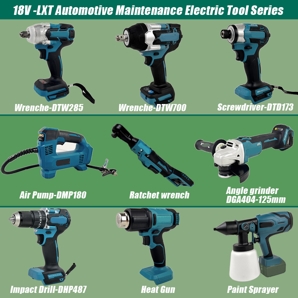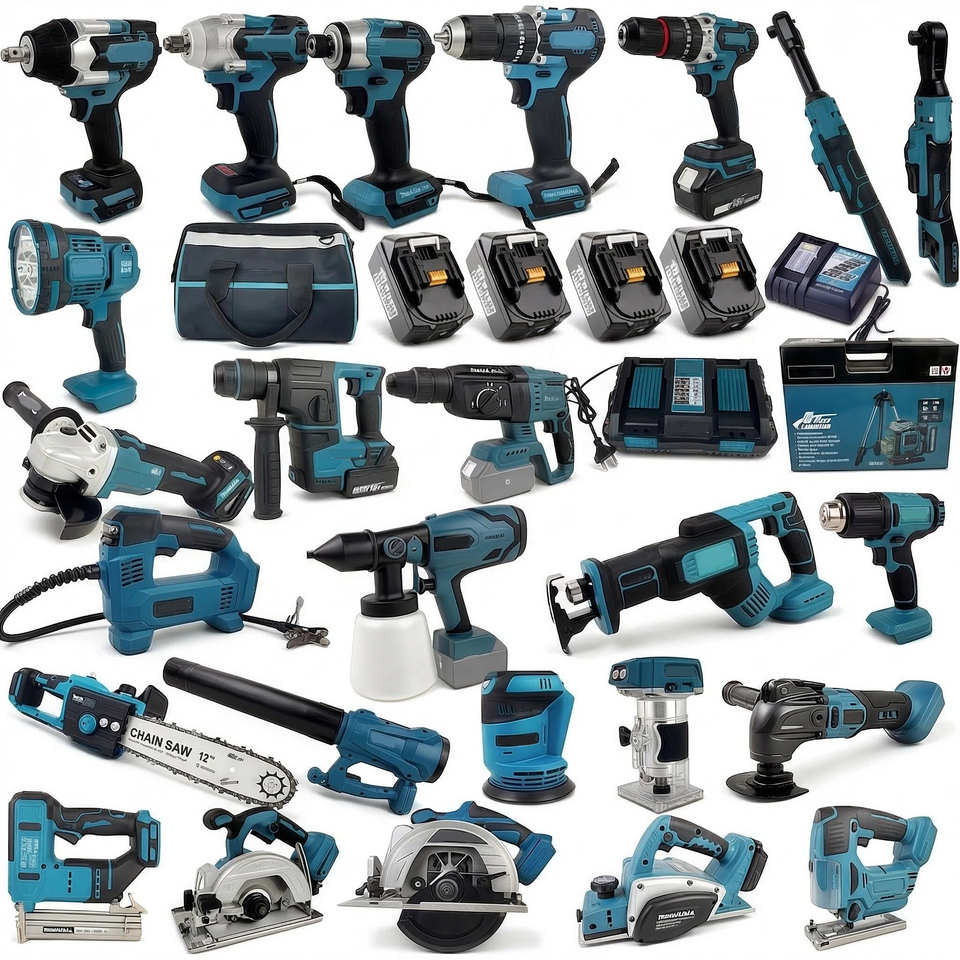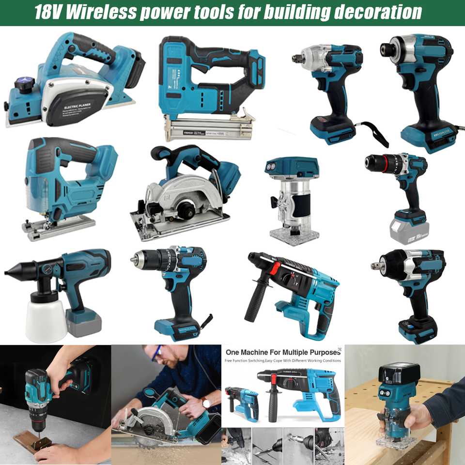 Adattatori, Batteria, Smerigliatrice di angolo, Caricabatterie, Circolare ha veduto, Combinazione, Trapano elettrico, Avvitatore elettrico, Sega elettrica, Electric Piallatrice, Martello elettrico, Trimmer elettrico, Chiave elettrica, Macinino, Impact driver, Illuminazione A LED, Chiave pneumatica, La maschera ha veduto, Livellamento, Nail Gun, Chiavi a cricchetto, Cacciavite