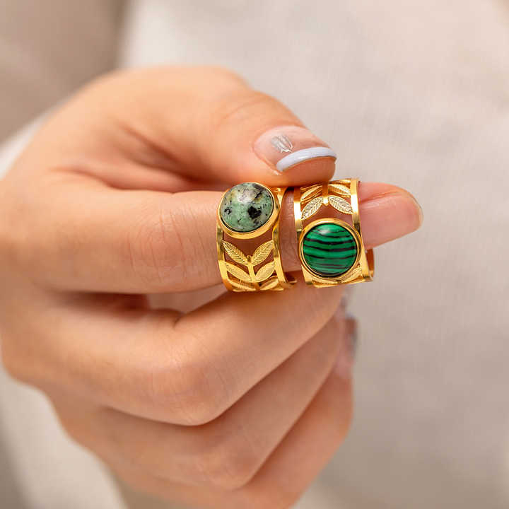 Anelli Aperti in Malachite Verde con Foglia Cava Placcati in Oro 18k e Acciaio Inossidabile per Donne