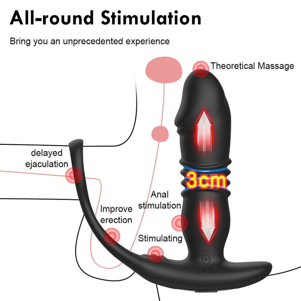 Male Anal Vibrators Massager Toy with Dual Cock Rings Butt Plug with 3 Thrust & 12 Vibration Modes Thrusting Prostate Massager