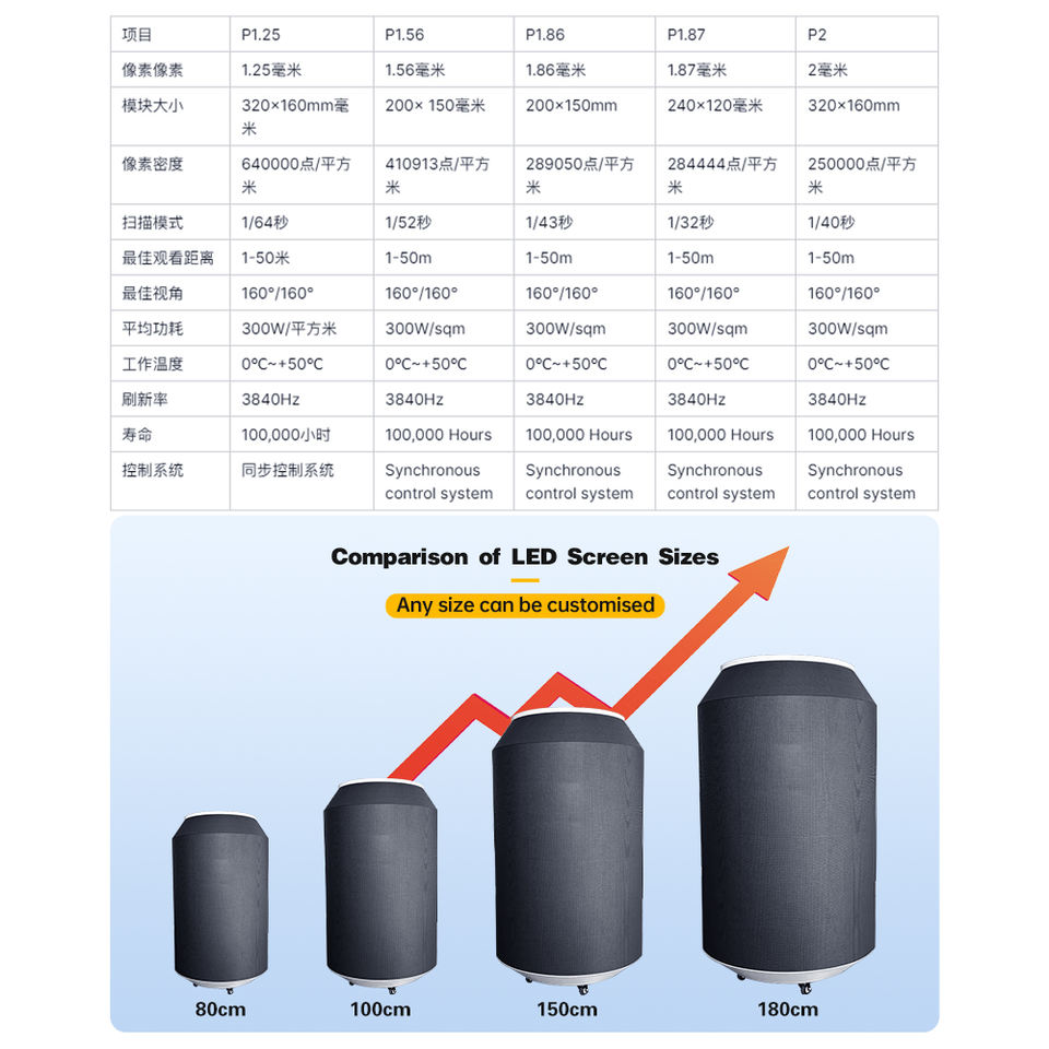 Pixel pitch:P1.25/P1.53/1.86/2/2.5/P3/P4/P5/P6.6/P8/P10