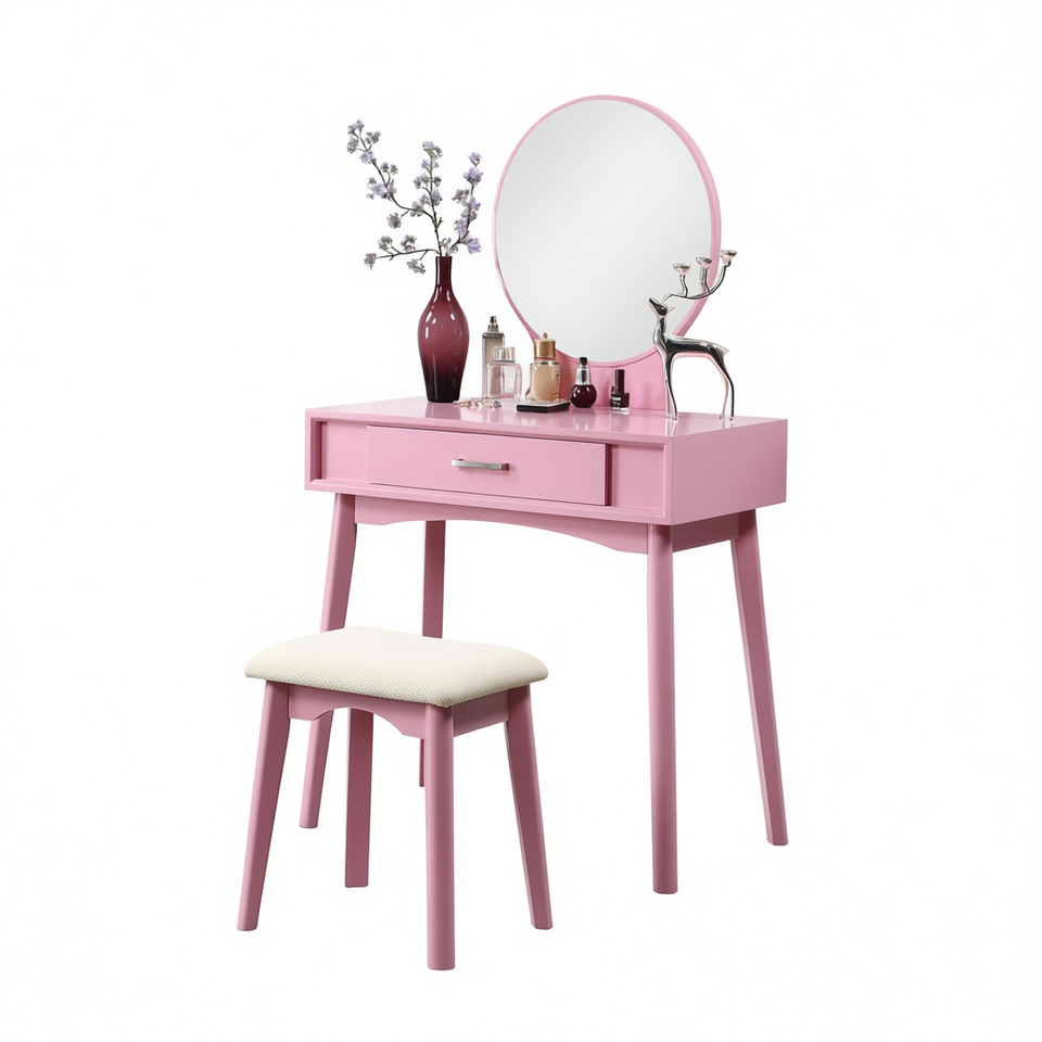Set Toeletta Contemporanea in Legno Maly con Specchio e Sgabello, Colore Rosa, per Camera da Letto