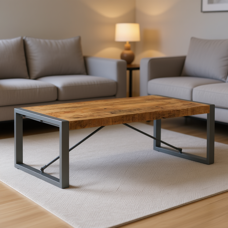 Tavolino da Caffè in Legno di Mango con Struttura in Acciaio, Arredamento Moderno Industriale per Soggiorno, Decorazione Casa Durevole
