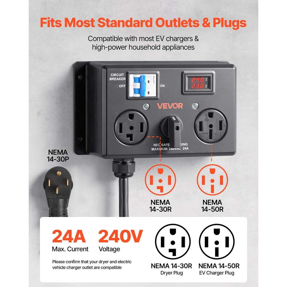 Interruttore Manuale per Ricarica EV NEMA 14-30P 14-30R 14-50R 24A Max 240V, Sdoppiatore di Alimentazione con Interruttore per Asciugatrice, Pronto per la Ricarica EV