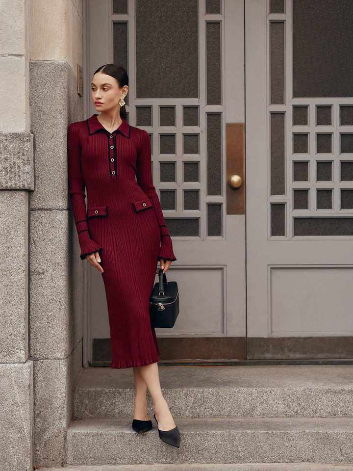 Abito Lungo in Maglia con Colletto Rovesciato, Maniche Lunghe a Campana, Stile Casual Personalizzabile con Logo o Design ODM per Donna