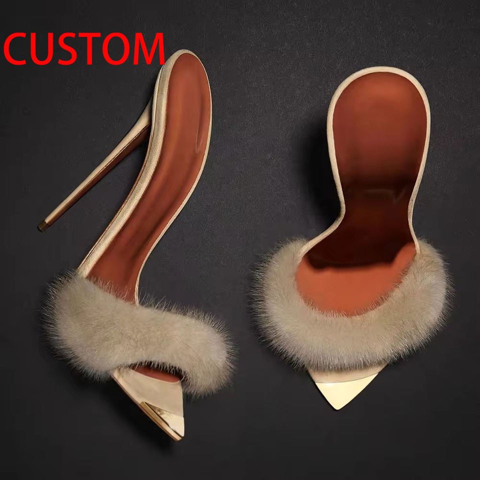 Mules di Lusso Personalizzate con Pelliccia Soffice e Tacco in Piuma per Donne, Sandali Sexy con Tacco a Spillo