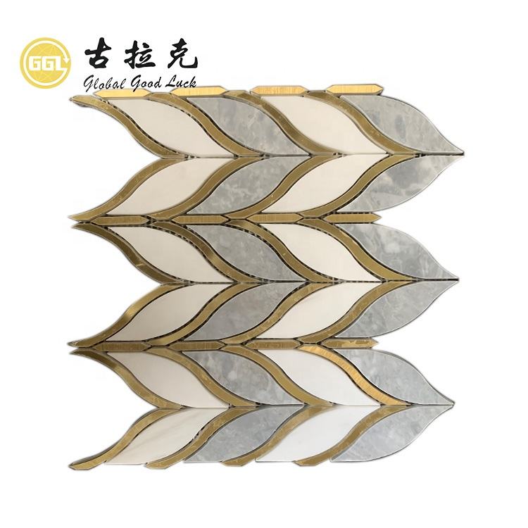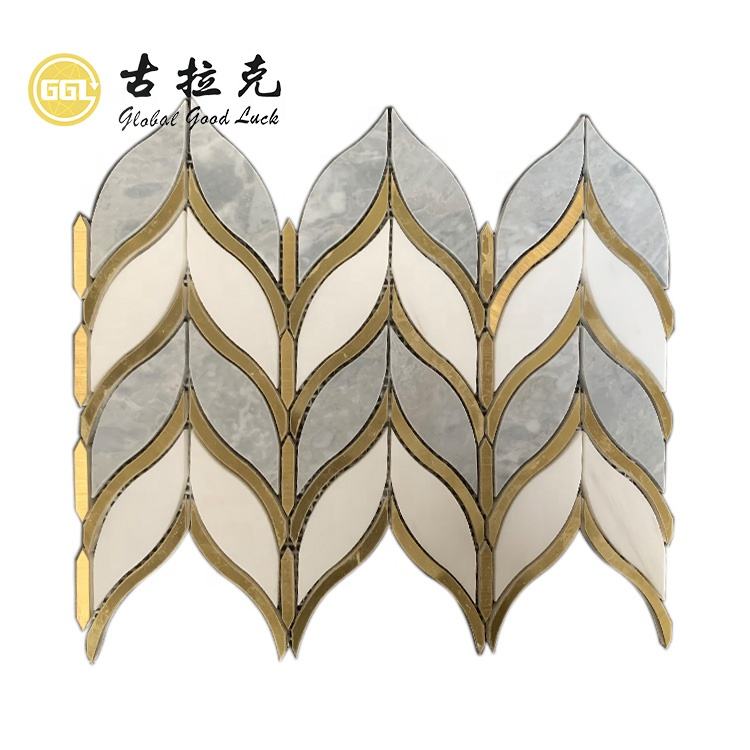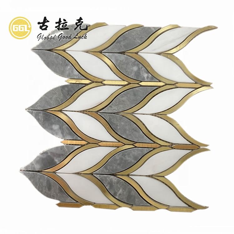 Marble waterjet mosaic tile brass tile inlay with marble waterjet mosaic