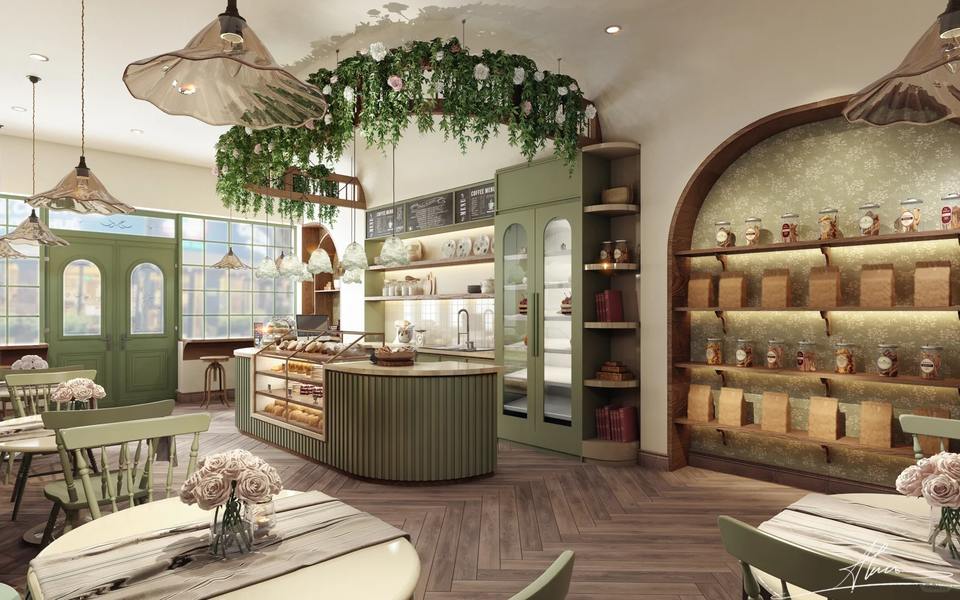 Design Personalizzato di Bancone Vetrina per Pasticceria in Marmo e Legno, Design di Arredamento per Caffetteria