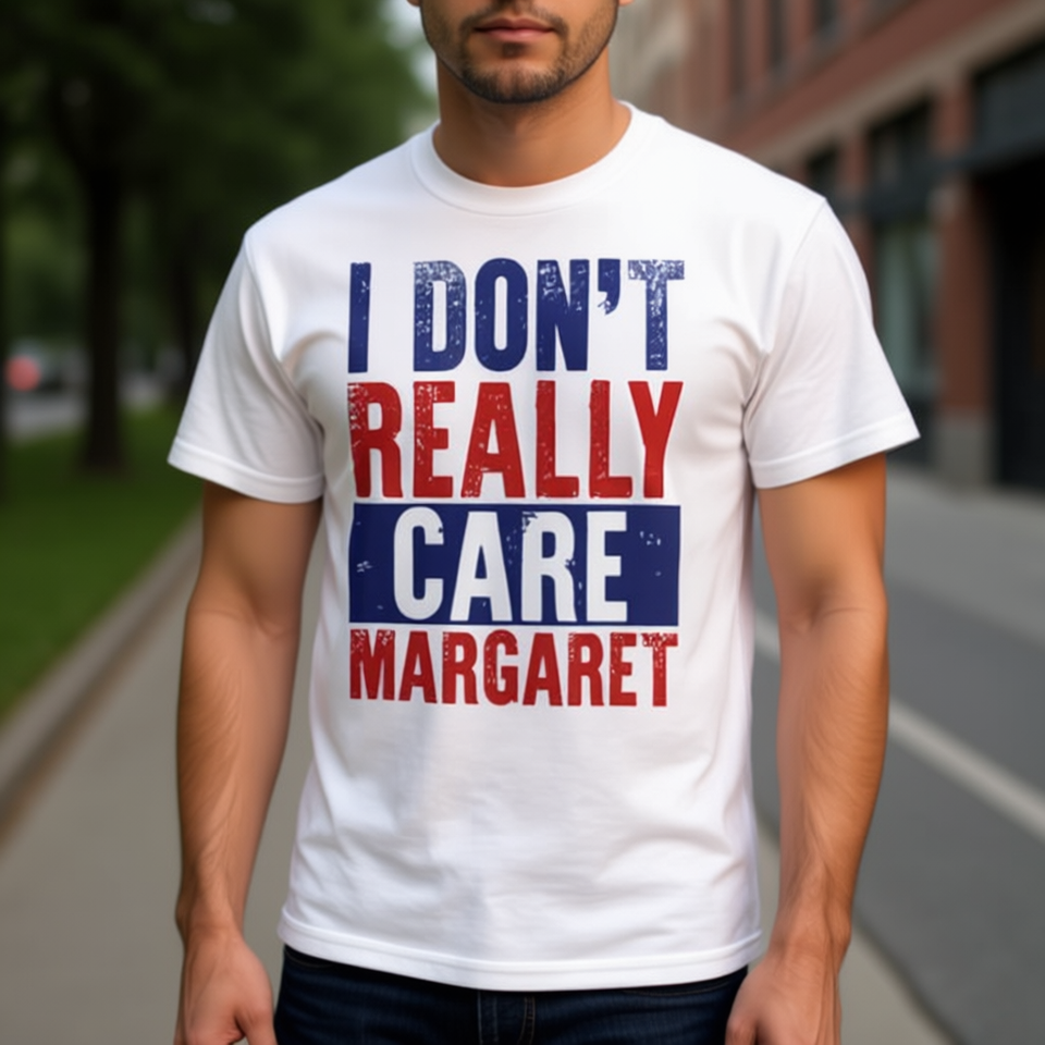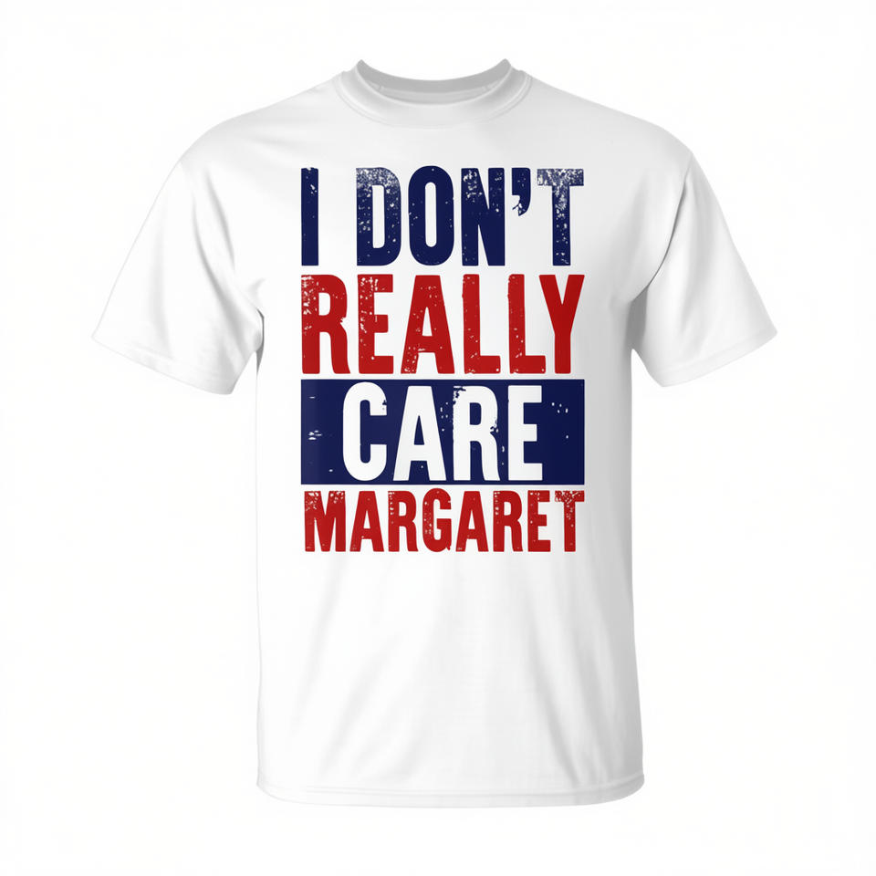 Maglietta promozionale di Margaret Apparels con scritta 'I Don't Really Care'