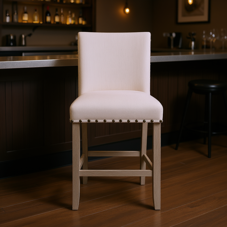 Sgabello da Bar Bianco Marian con Base in Legno, Rivestimento in Tessuto e Finitura con Borchie, Design Contemporaneo per Arredamento Bar Domestico