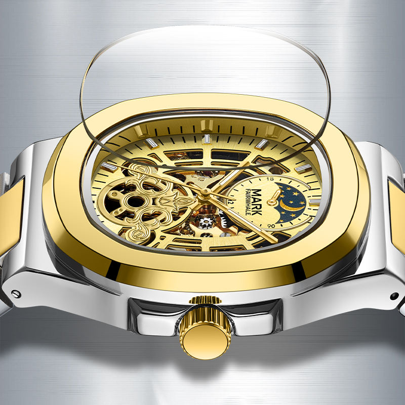 Mark Fairwhale Orologio automatico quadrato FW-6012 cassa 40 mm acciaio, scheletrato, lancette luminose, chiusura a farfalla