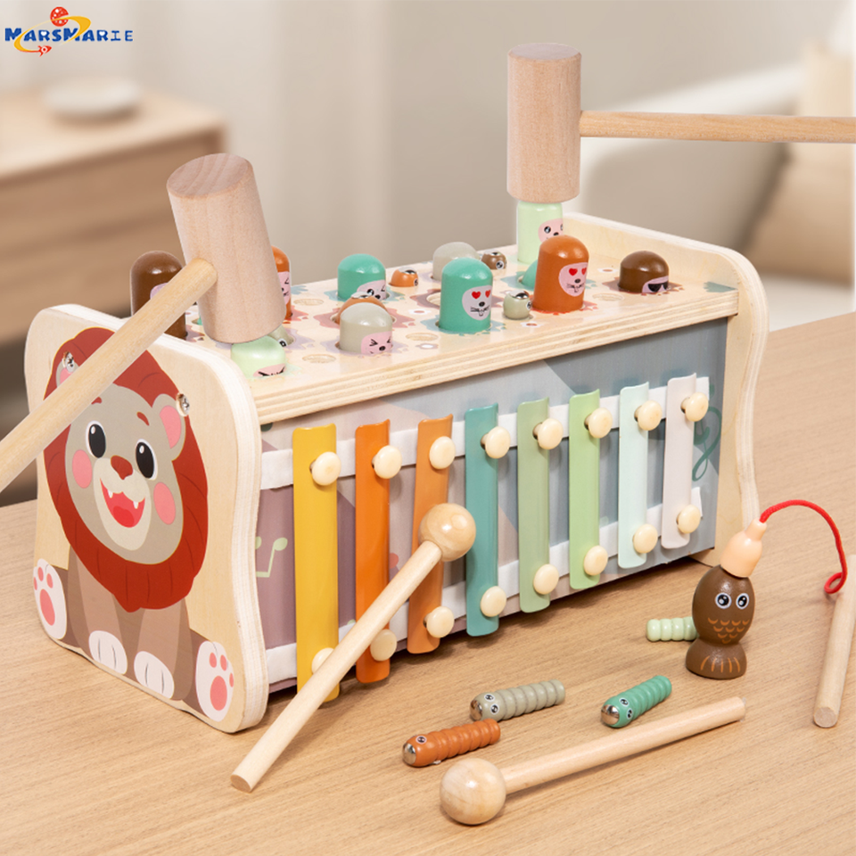 MarsMarie Whack-A-Mole Wooden Montessori Educational Toy for 1-4 Year Olds Hammering Pounding Xylophone Fishing Game