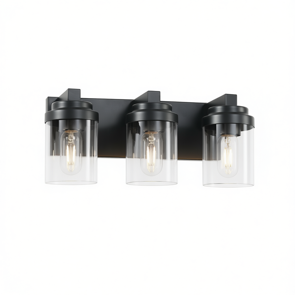 Lampada da Bagno a 3 Luci in Ferro Nero Opaco con Paralume in Vetro Trasparente, Stile Industriale, Montaggio a Superficie