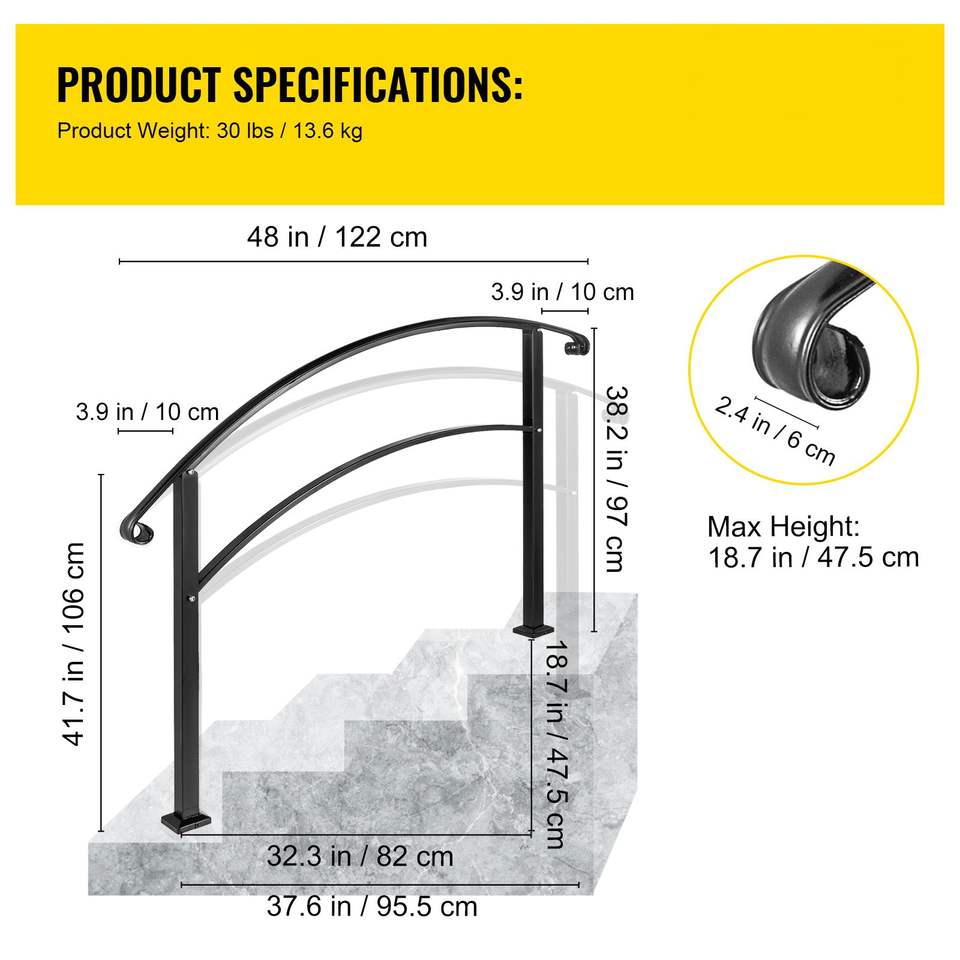 Kit di Installazione Corrimano in Ferro Battuto Nero Opaco a 4 Gradini per Esterni, Ringhiera per Scale Ripide da 1 a 4 Gradini, Corrimano Facili da Installare
