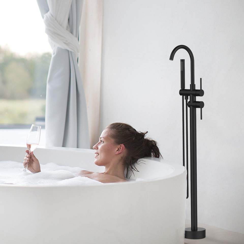 Miscelatore per Vasca da Bagno e Doccia Autoportante Nero Opaco ad Alta Portata con Doccetta, Montaggio a Pavimento, Stile Moderno