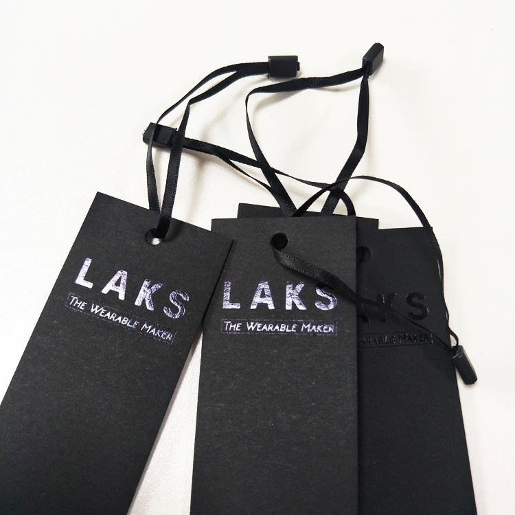 Etichette pendenti in cartoncino nero con laminazione opaca e lamina d'argento per abbigliamento