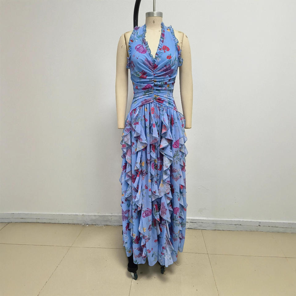 Abiti Lunghi Casual Maxi con Schiena Scoperta e Spacco, Vestito Elegante Estivo da Donna con Collo all'Americana, Motivo Floreale e Volant