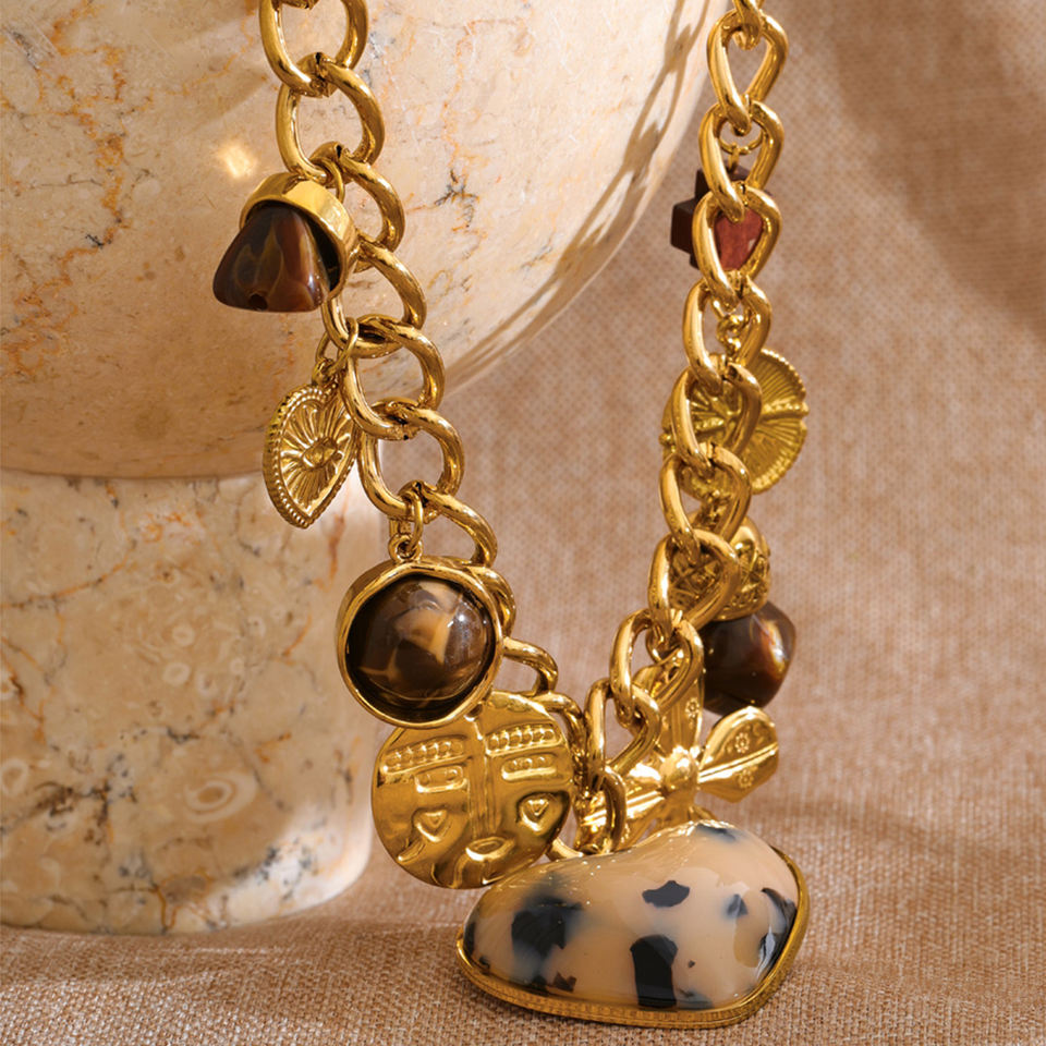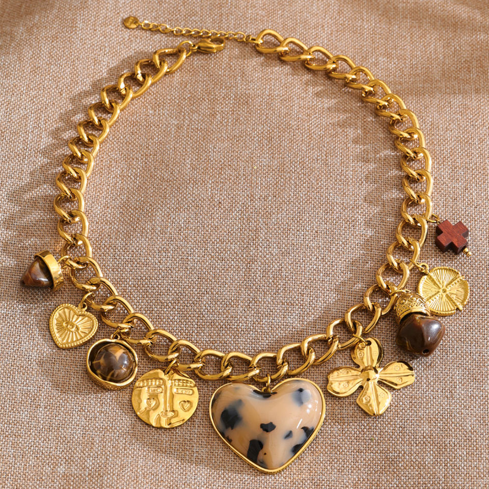 Collana Mchic 577 alla Moda in Acciaio Inossidabile Placcato Oro 18K con Catena Spessa e Ciondolo a Cuore in Resina con Stampa Leopardata