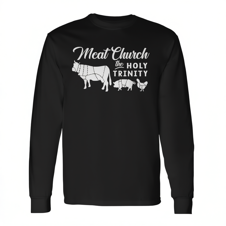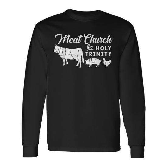 Maglietta a maniche lunghe Meat Church: T-shirt promozionale unica con la Sacra Trinità del barbecue