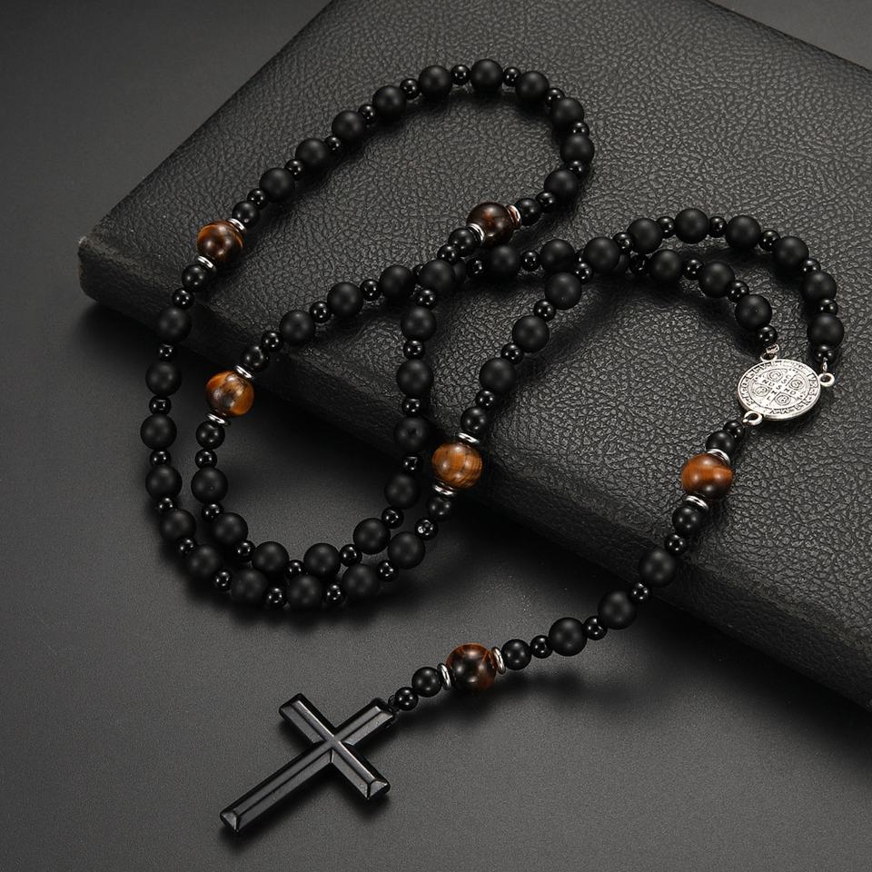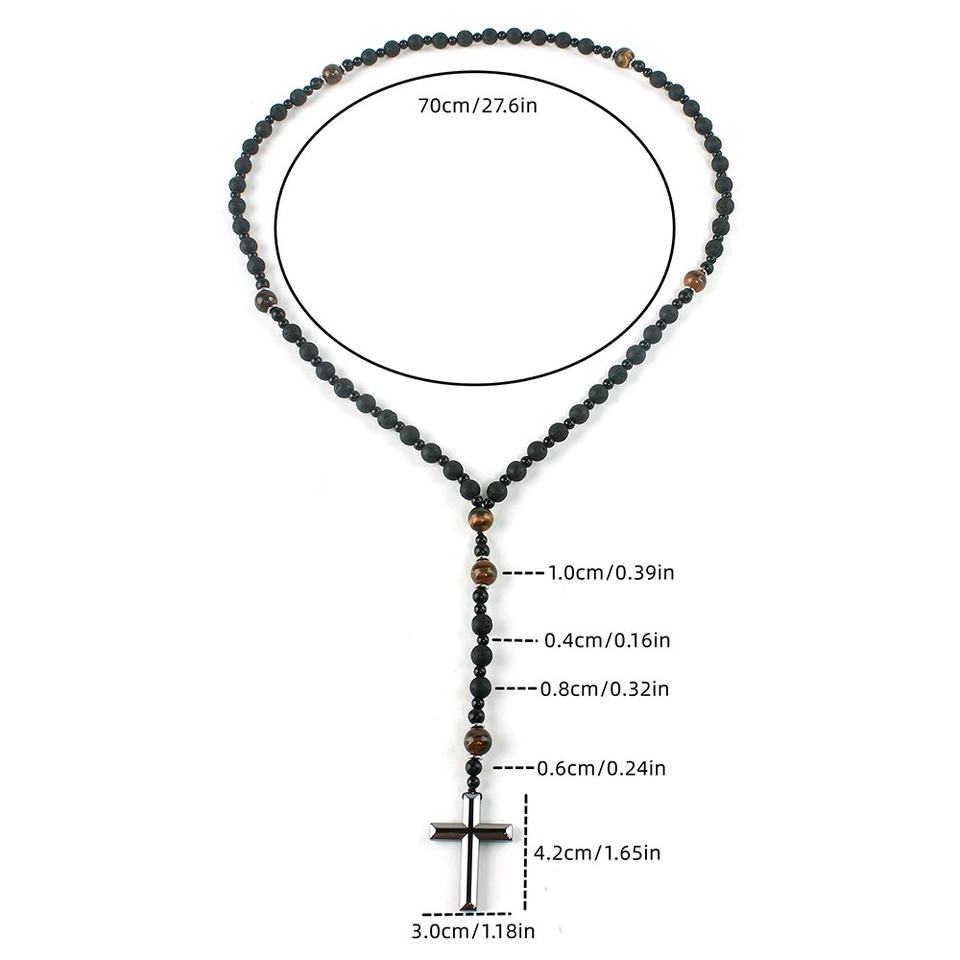 Mecrt Christianity rosario uomo collana Cross-religiosa con roccia vulcanica nera naturale giallo occhio di tigre perle di pietra di ferro