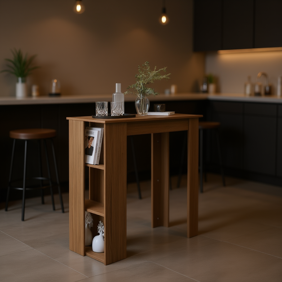 Tavolo da bar in legno ingegnerizzato color rovere marrone medio con ripiano portaoggetti, design moderno e minimalista per l'uso in casa o nel bar.