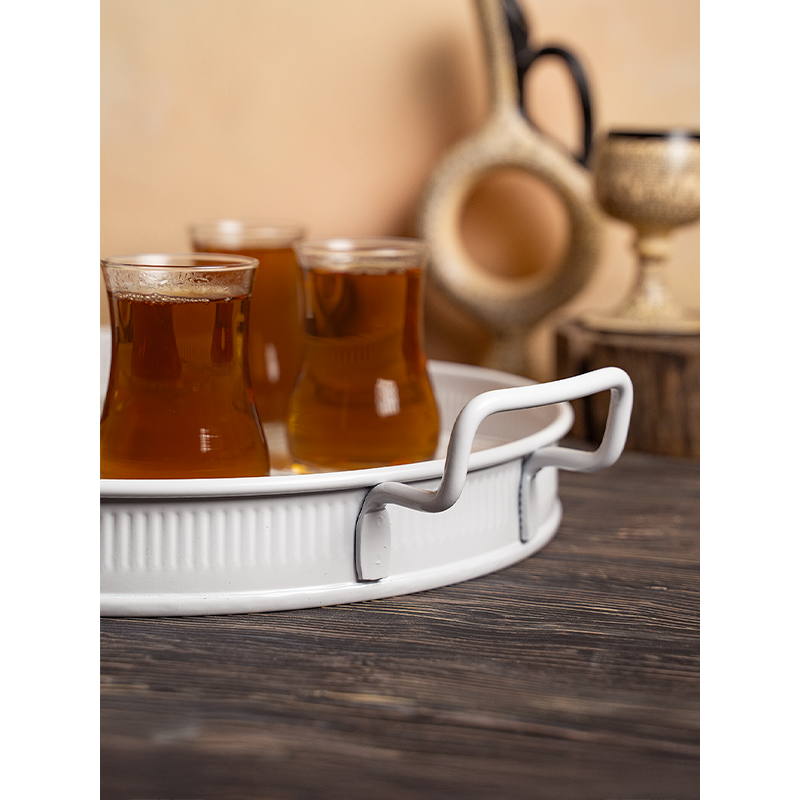 Vassoio ovale di medie dimensioni in metallo zincato con pareti laterali decorate e manici in filo spesso – dalla Turchia